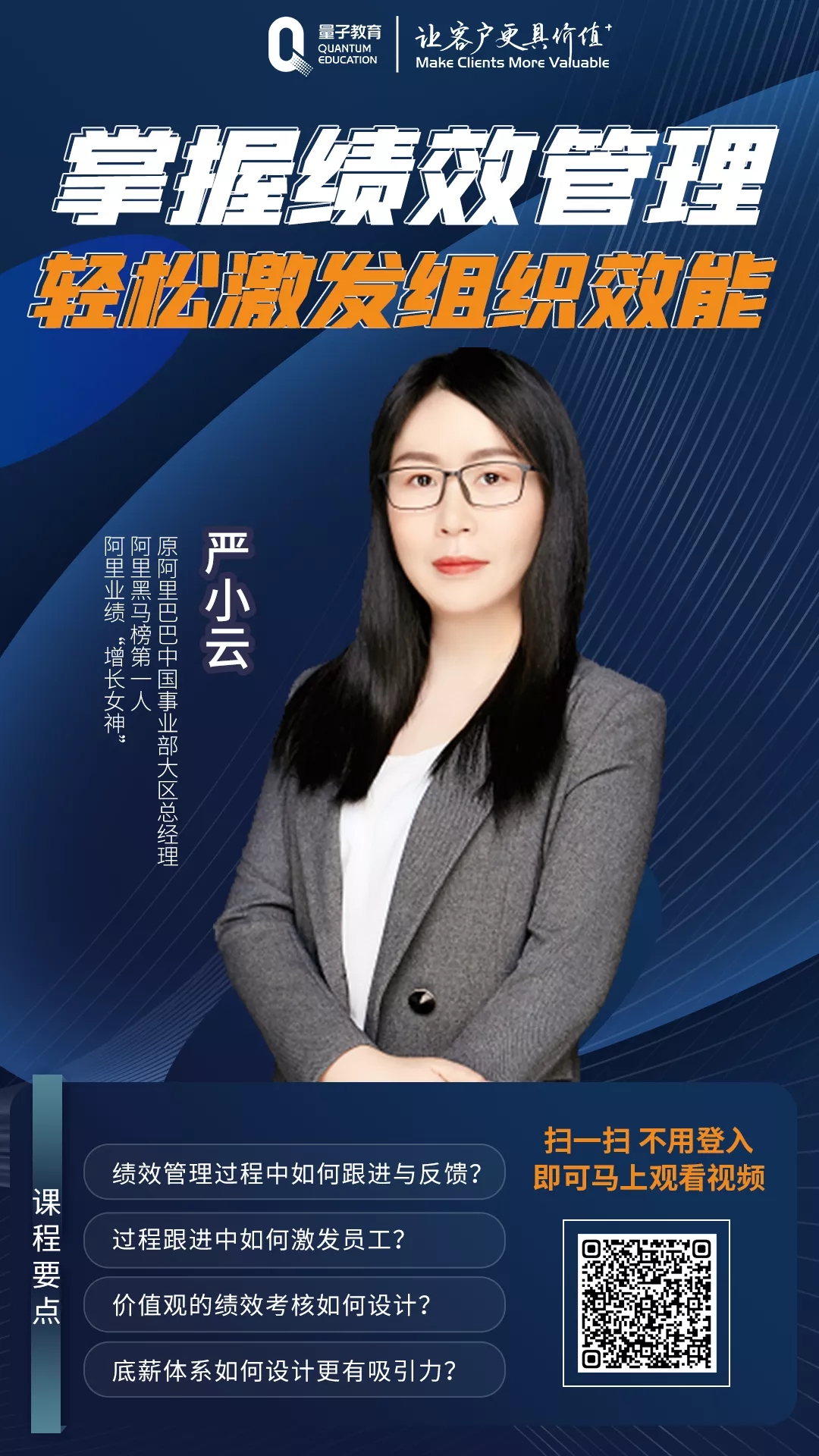 原阿里巴巴中國區事業部總經理、阿里“增長女神”嚴小云老師聯合量子教育推出了全新精品好課《掌握績效管理,輕松激發組織效能》。